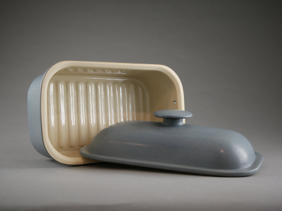Gesunde, atmungsaktive Lagerung: Luftzirkulation durch seitliche Löcher und Rillen im Boden. Die Deckelinnenseite ist unglasiert. Feuchte kann hier anlagern, dringt aber nicht ein, da der Deckel dicht gesintert ist. Diese wird wieder ans Brot abgegeben und das Brot bleibt länger frisch. Das Unterteil kann zum Brotbacken verwendet werden.